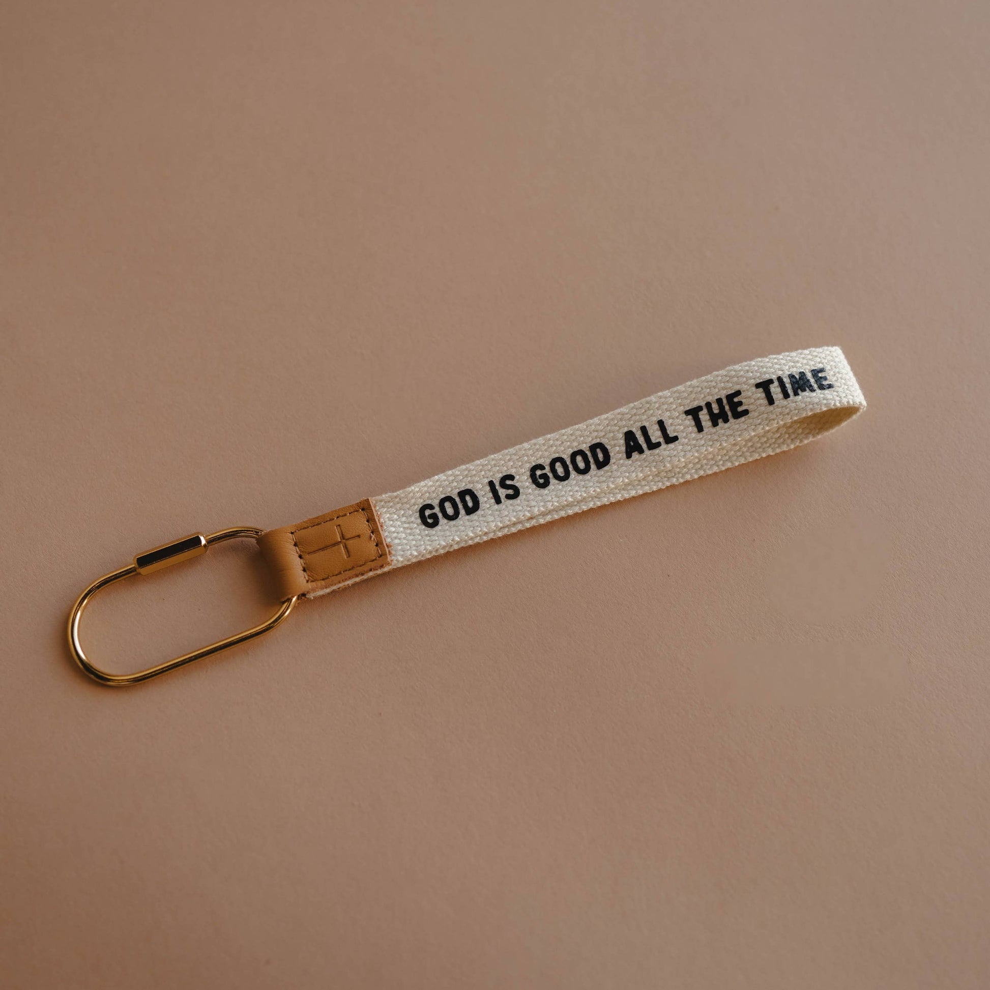 -Wristlet is 3/4" x 6 1/2" on woven fabric with 2" gold carabiner.