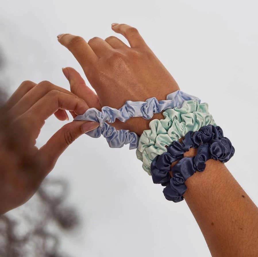 Each package includes five satin scrunchies in assorted garden-inspired tones.