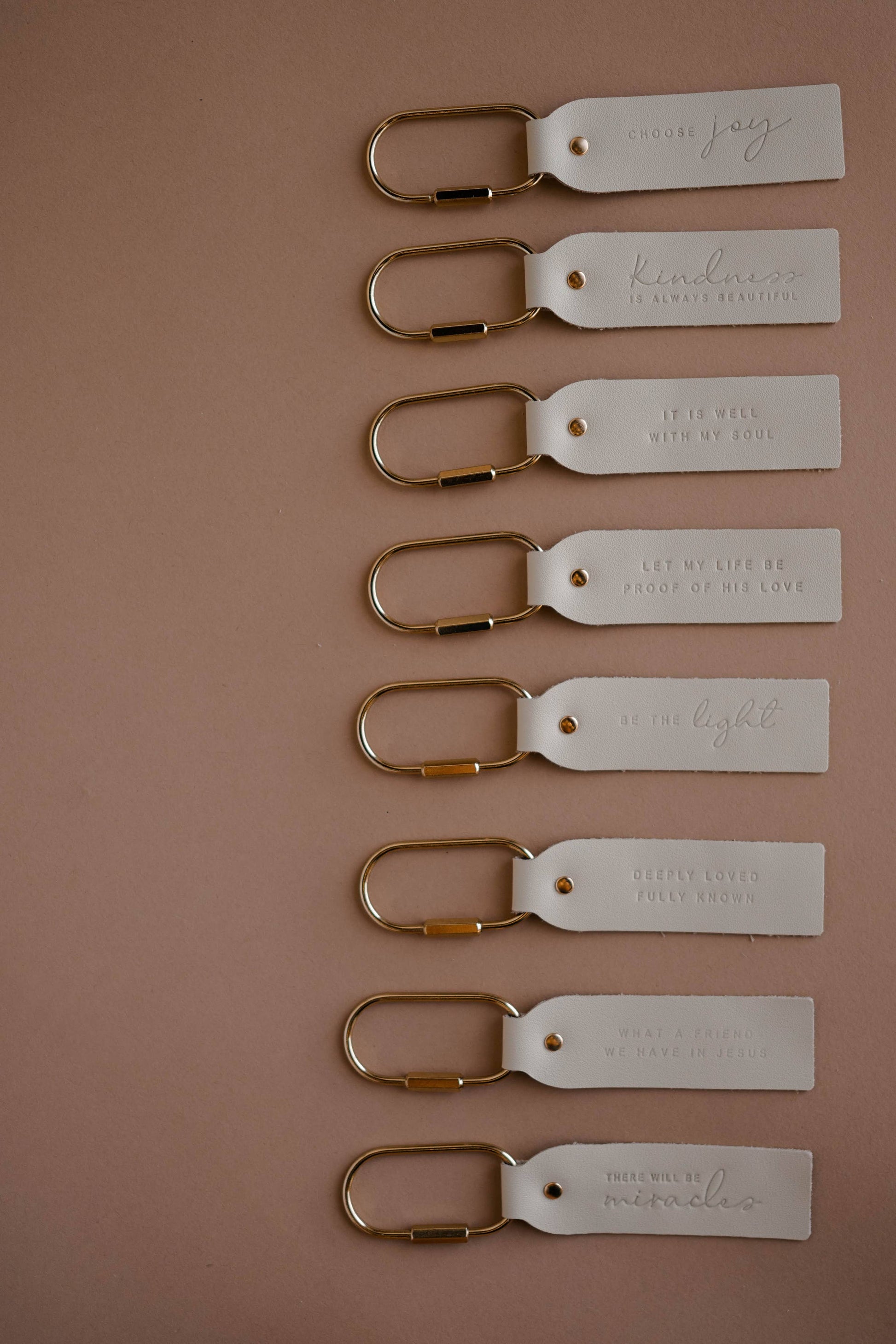 - Blonde Color 2" Carabiner 4" Wide Stamped Leather Fob